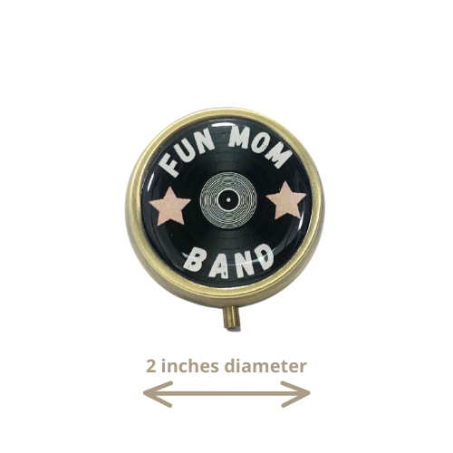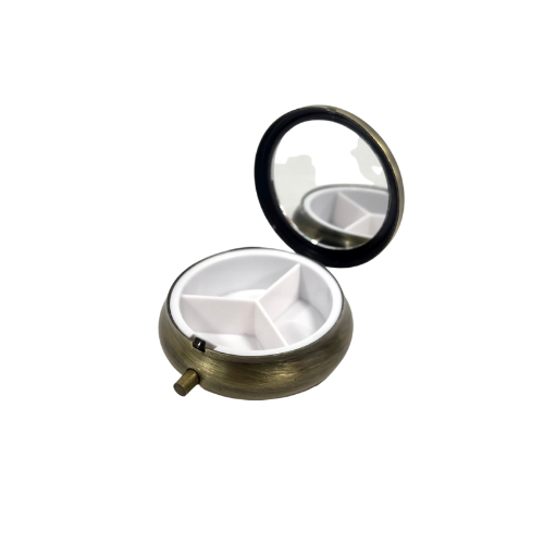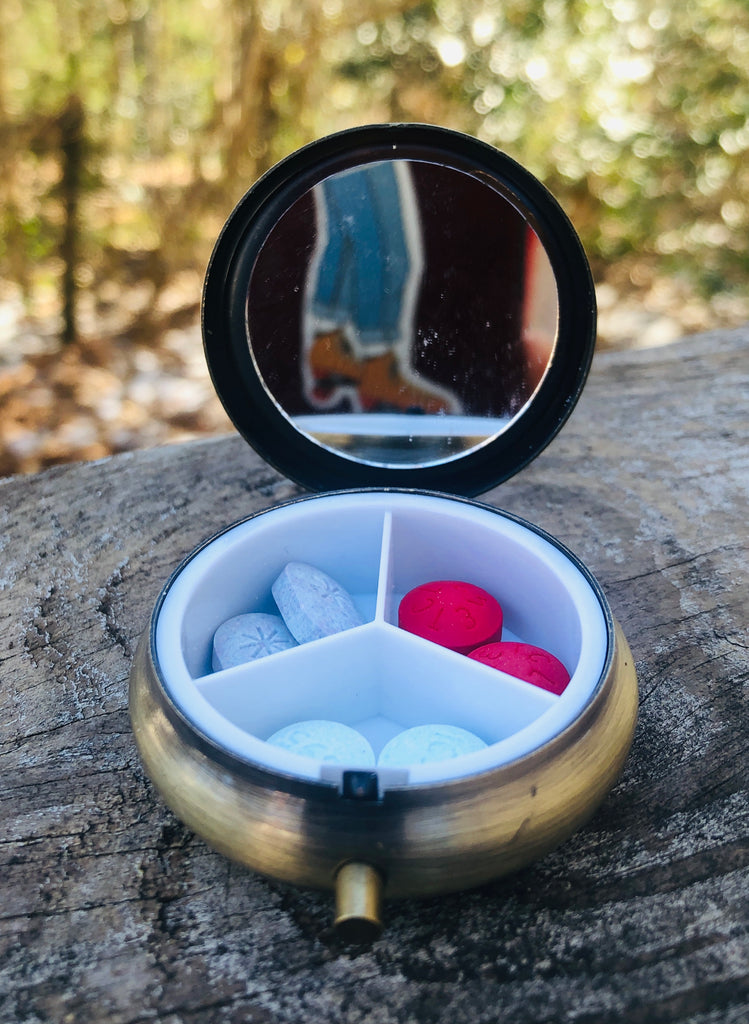 This on-the-go pill box measures 2 inches long, 3/4 inches high and fits perfectly in Mom's Fanny. The interior is divided into three compartments and opens up to a mirror that reflects the lovely you.